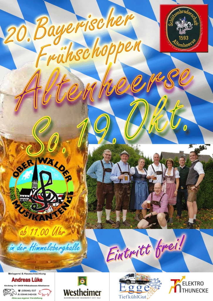 Die St. Fabian und Sebastian Schützenbruderschaft Altenheerse lädt zum 20. Bayerischen Frühschoppen in die Himmelsberghalle Altenheerse ein.